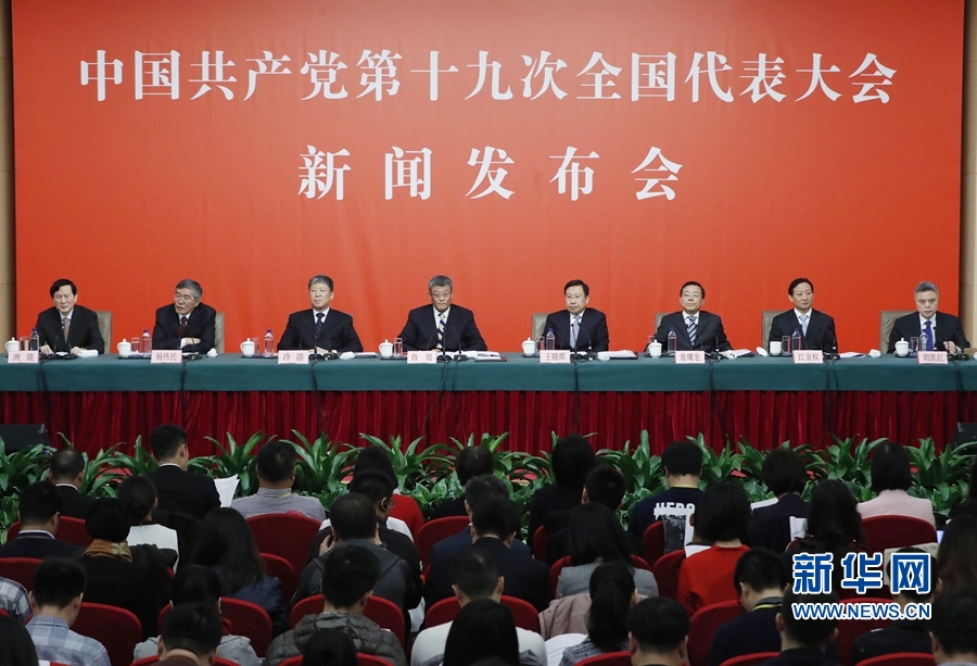 10月26日,中国共产党第十九次全国代表大会新闻发言人庹震召开专题新闻发布会,请中央纪委副书记肖培,中央政策研究室常务副主任、中央宣传部副部长王晓晖,中央文献研究室主任冷溶,国务院法制办公室党组书记、副主任袁曙宏,中央财经领导小组办公室副主任杨伟民,中央纪委驻国资委纪检组组长、国资委党委委员江金权解读十九大报告,并回答记者提问。新华社记者 沈伯韩 摄