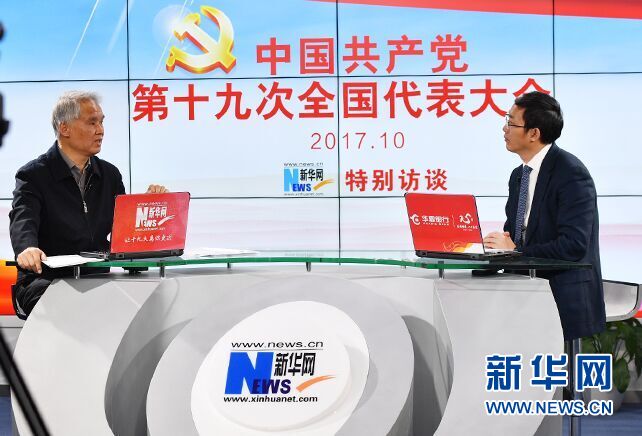 图为新华网十九大特别访谈现场,新华网总编辑郭奔胜对话中共中央党史研究室原副主任李忠杰,深度解读新修改的党章。新华网 郭小天 摄