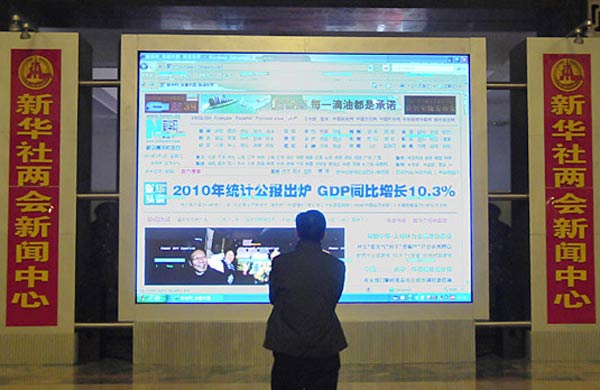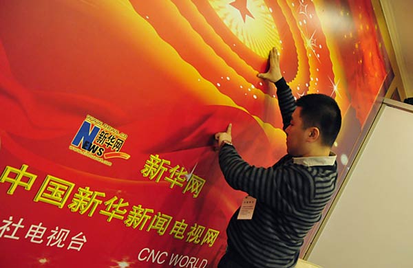 3月1日,新华网两会报道人员正在布置工作间。第十一届全国人民代表大会第四次会议、全国政协十一届四次会议即将开幕。