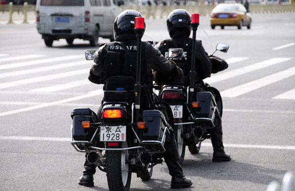 3月1日,特警队员在人民大会堂东门外巡逻。十一届全国人大第四次会议、全国政协十一届四次会议即将开幕。