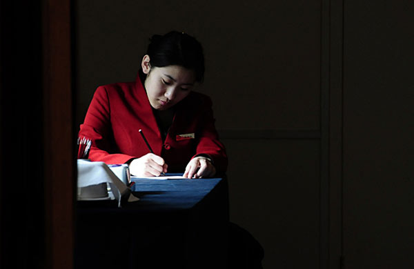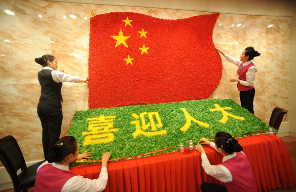 3月2日,京西宾馆的服务员用绢花拼出国旗和“喜迎人大”的图案。当日,为了迎接全国人大代表入住,京西宾馆的服务员自发设计,并从市场上采购来绢花,在餐厅拼出组合图案,表达“喜迎人大”的心情。