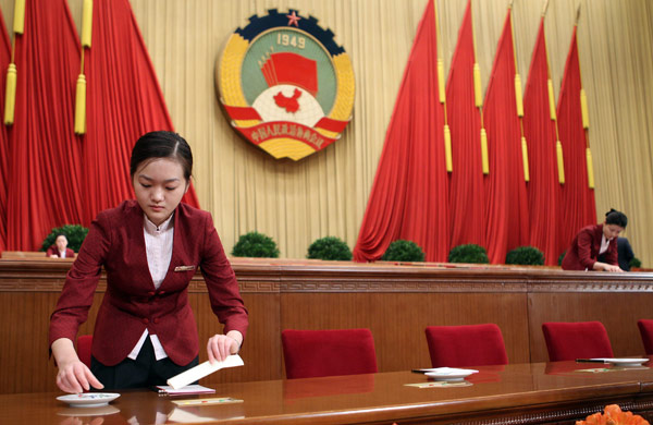 3月3日,人民大会堂的工作人员在布置会场。当日15时,中国人民政治协商会议第十一届全国委员会第四次会议将在北京人民大会堂开幕。