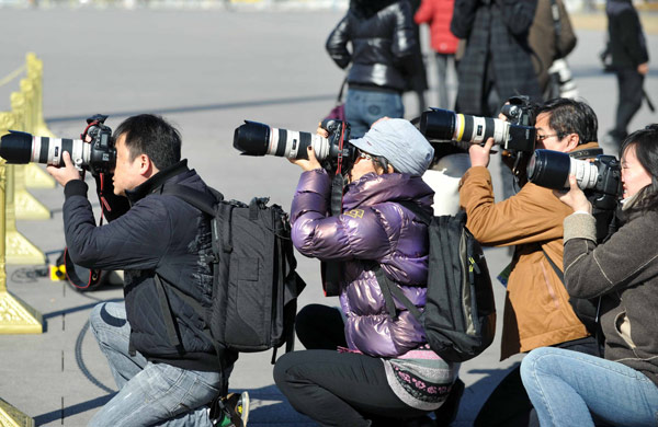 3月3日,4名摄影记者蹲在地上拍照。当日,中国人民政治协商会议第十一届全国委员会第四次会议在北京人民大会堂开幕。