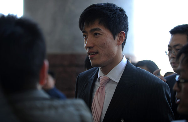 全国政协委员刘翔步入会场。3月3日,中国人民政治协商会议第十一届全国委员会第四次会议在北京人民大会堂开幕。