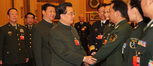 3月12日,中共中央总书记、国家主席、中央军委主席胡锦涛出席十一届全国人大五次会议解放军代表团全体会议。