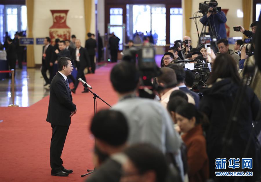 3月12日,十三届全国人大二次会议在北京人民大会堂举行第三次全体会议。这是国家知识产权局局长申长雨在“部长通道”接受采访。 新华社记者金立旺摄