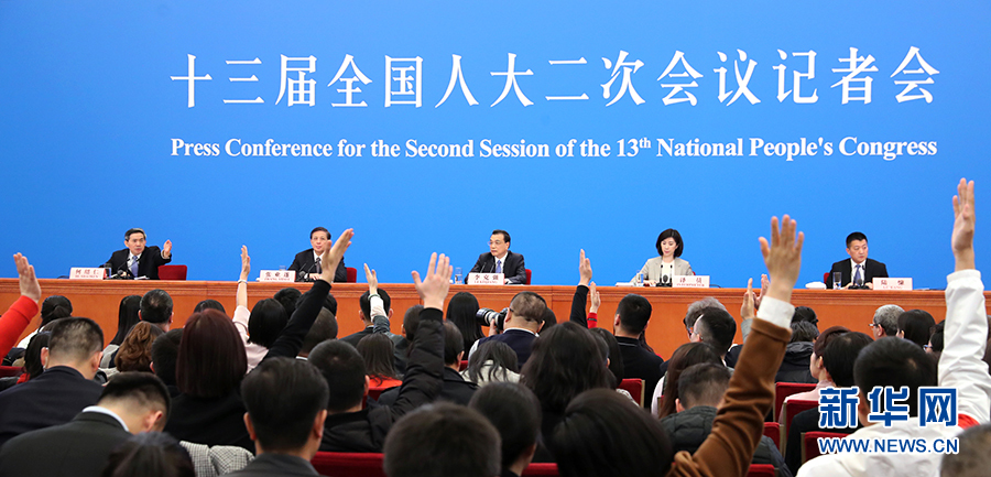3月15日,国务院总理李克强在北京人民大会堂会见采访十三届全国人大二次会议的中外记者并答记者问。这是记者举手提问。 新华社记者 殷刚 摄