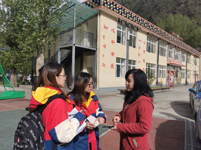 成都日报锦观新闻记者吴喆(中)和同事在德格县柯洛洞乡中心小学采访成都高新区援藏工作队队员陶海琳老师