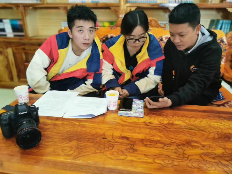成都日报锦观新闻记者吴喆(中)和同事在德格县马尼干戈寄宿制学校采访成都高新区教育援藏工作队队长兰长明