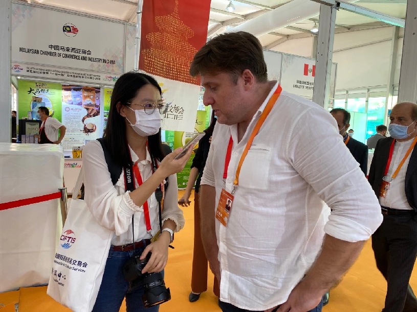 在2020年中国国际服务贸易交易会上,记者王迪正在采访来自格鲁吉亚的参展商。