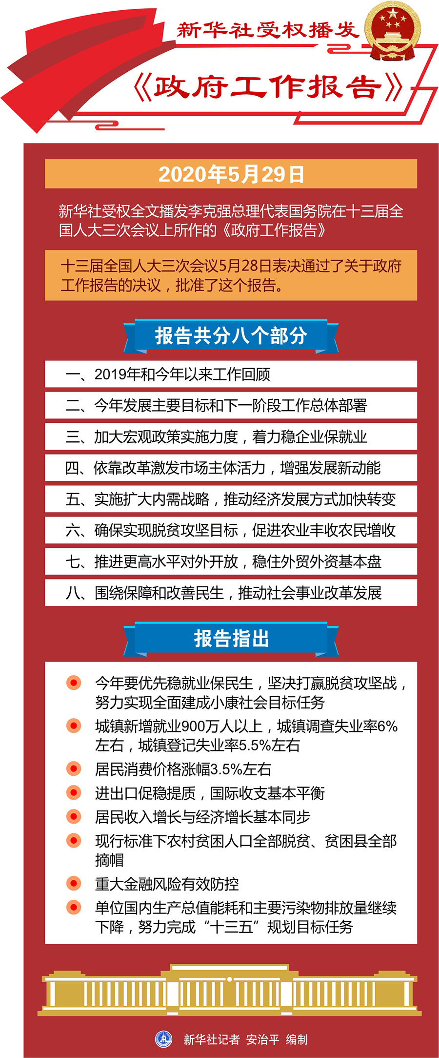 新华社北京5月29日电 新华社受权于29日全文播发李克强总理代表国务院在十三届全国人大三次会议上所作的《政府工作报告》。十三届全国人大三次会议5月28日表决通过了关于政府工作报告的决议,批准了这个报告。