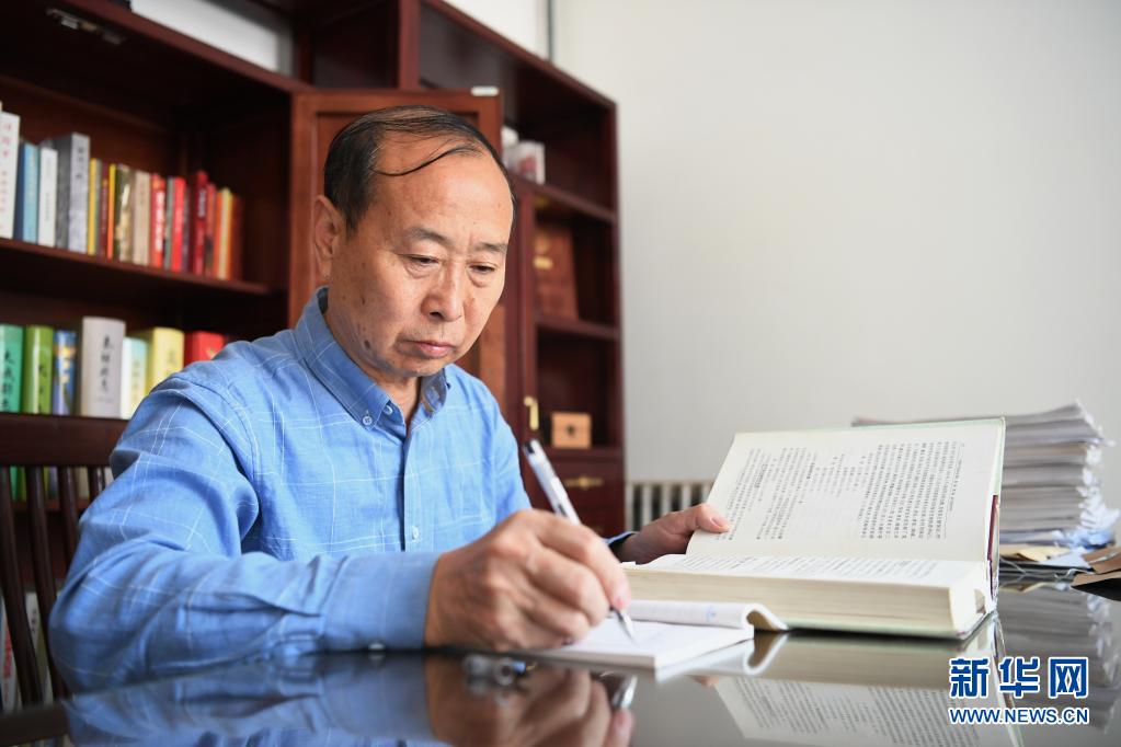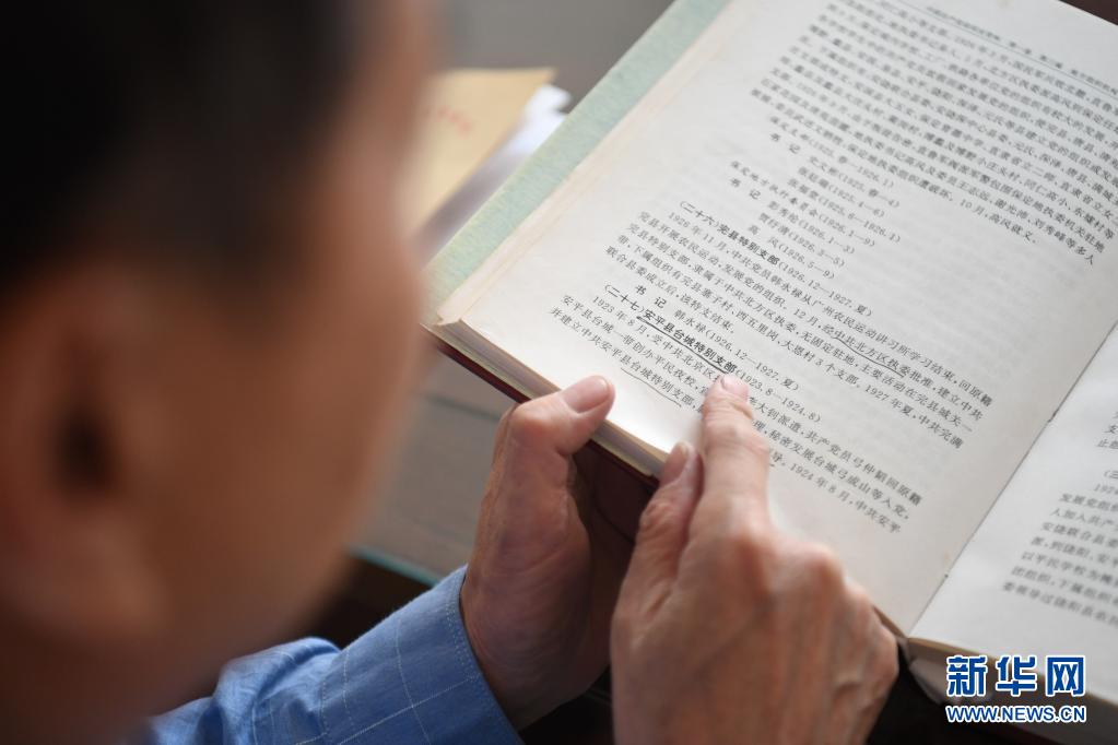 5月8日,河北省安平县红色文化研究会会长李建抓在家中翻阅党史资料。新华社记者 朱旭东 摄