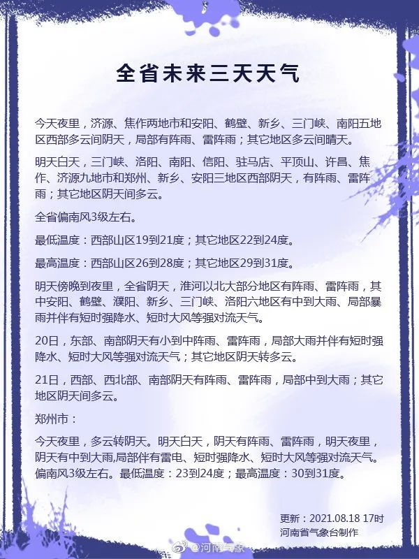 19日下午到夜间,淮河以北大部有阵雨、雷阵雨,安阳、鹤壁、新乡、濮阳、三门峡、洛阳等县市有中到大雨、局部暴雨(25~45毫米、局部70~100毫米),局地伴有7-8级短时大风;郑州市有中到大雨伴有雷电,局部有暴雨。