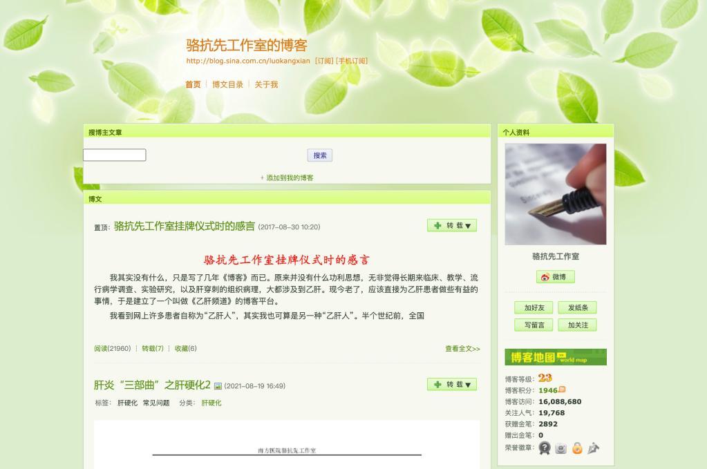 如今,社交媒体平台也成为他的科普阵地。翻看骆抗先的微信公众号,《“乙肝两对半”有什么意义?》《怎样判断肝炎病情的轻重》《肝脏B超检查结果怎样看?》,均是被人广为阅读的热门文章。