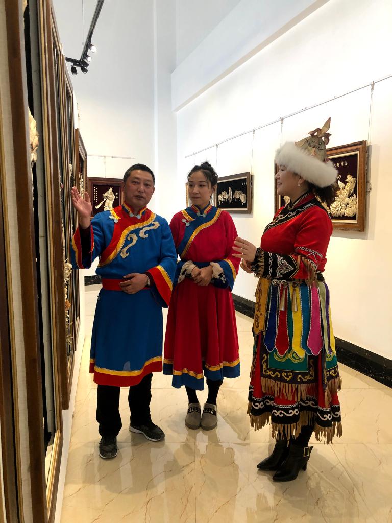 刘蕾(右一)在基层调研赫哲族特有文化“鱼皮画制作”的保护传承。(受访者提供)