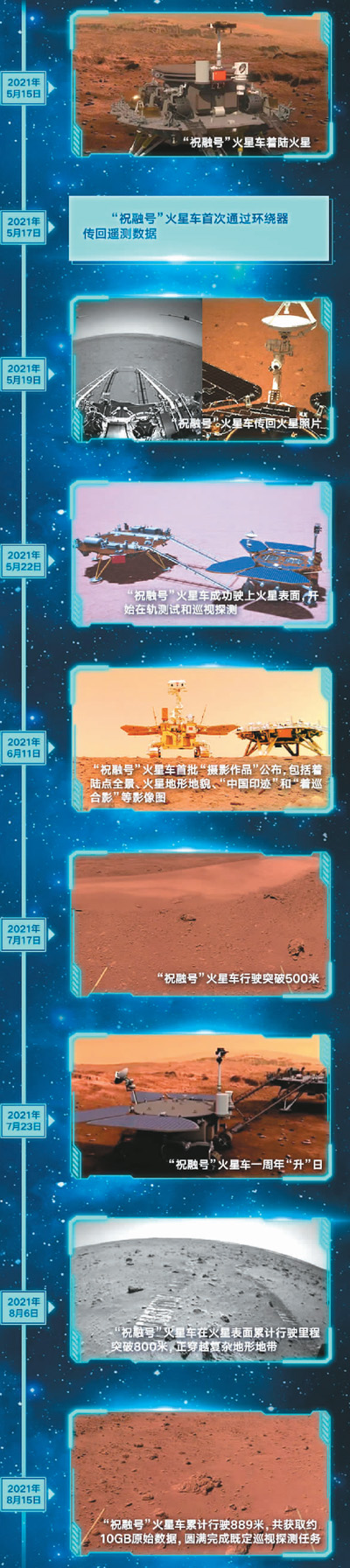 从2020年7月23日在海南文昌发射升空到2021年2月到达火星附近实施火星捕获;从2021年5月15日成功着陆于火星乌托邦平原南部预选着陆区到5月19日与着陆器成功分离并驶上火星表面;从2021年6月11日火星首批科学影像图发布到6月27日火星全局环境感知图像和移动过程视频发布,“祝融号”火星车实现的中国航天一个个历史性突破,吸引了全世界的目光。