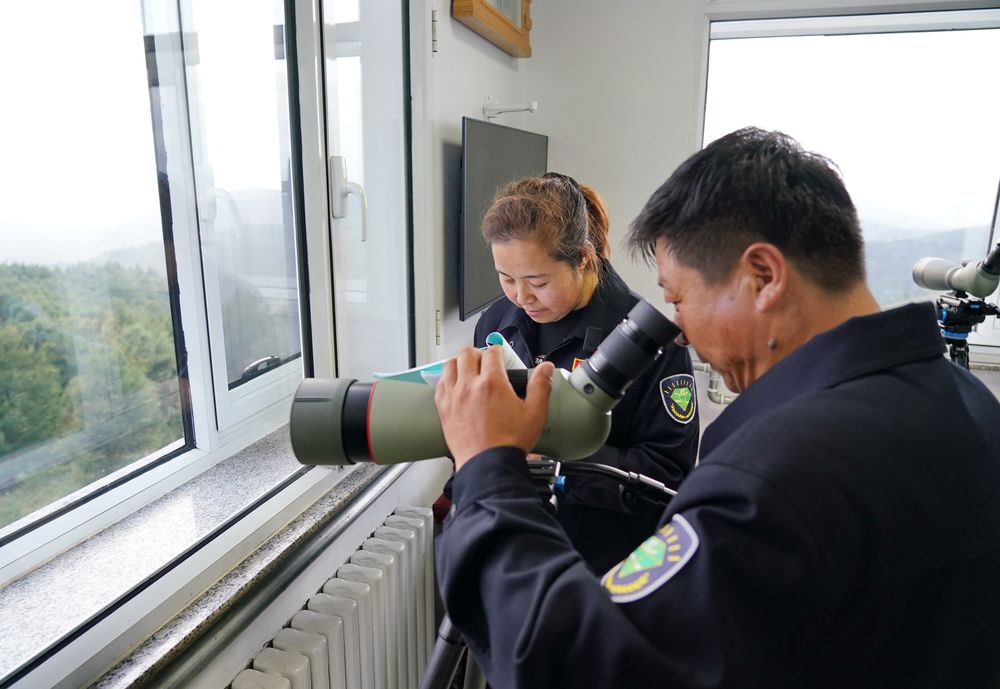 ↑刘军(右)、王娟在塞罕坝机械林场月亮山望海楼内工作(2021年8月23日摄)。
