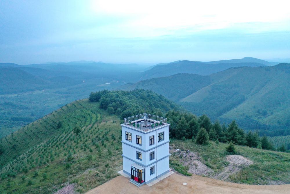 ↑塞罕坝机械林场月亮山望海楼(2021年8月23日摄,无人机照片)。