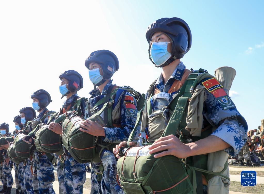 8月23日,在俄罗斯梁赞州日多瓦空降场,参加“空降排”空降兵分队比赛的中国参赛队队员准备就绪。新华社发(方超 摄)