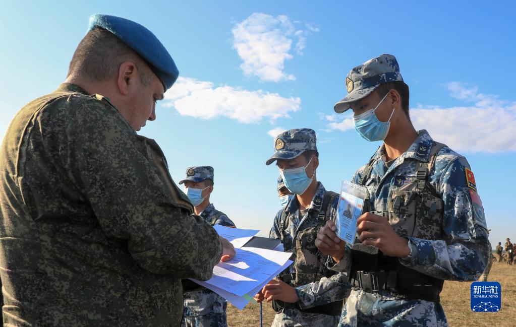 8月23日,在俄罗斯梁赞州日多瓦空降场,参加“空降排”空降兵分队比赛的中国参赛队队员进行赛前身份检录。新华社发(方超 摄)