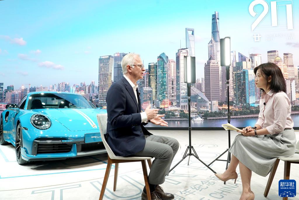 4月19日,保时捷高管在第十九届上海国际汽车工业展览会上接受采访。新华社记者 陈建力 摄