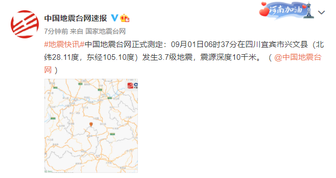 中国地震台网正式测定:09月01日06时37分在四川宜宾市兴文县(北纬28.11度,东经105.10度)发生3.7级地震,震源深度10千米。