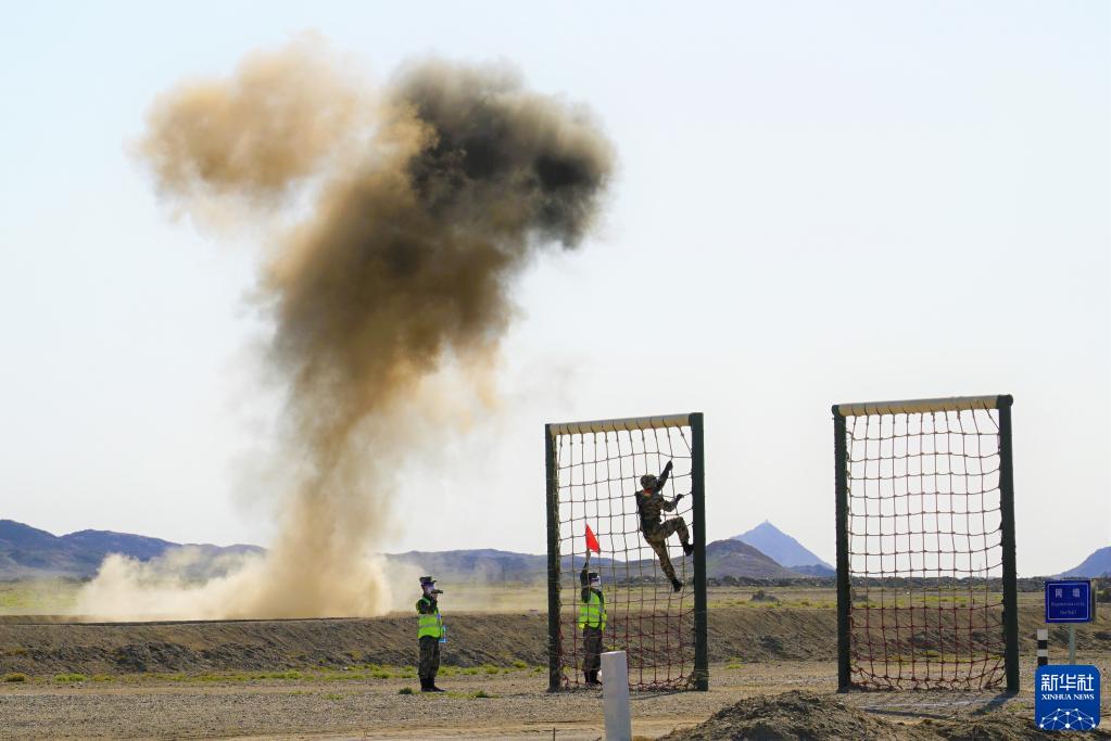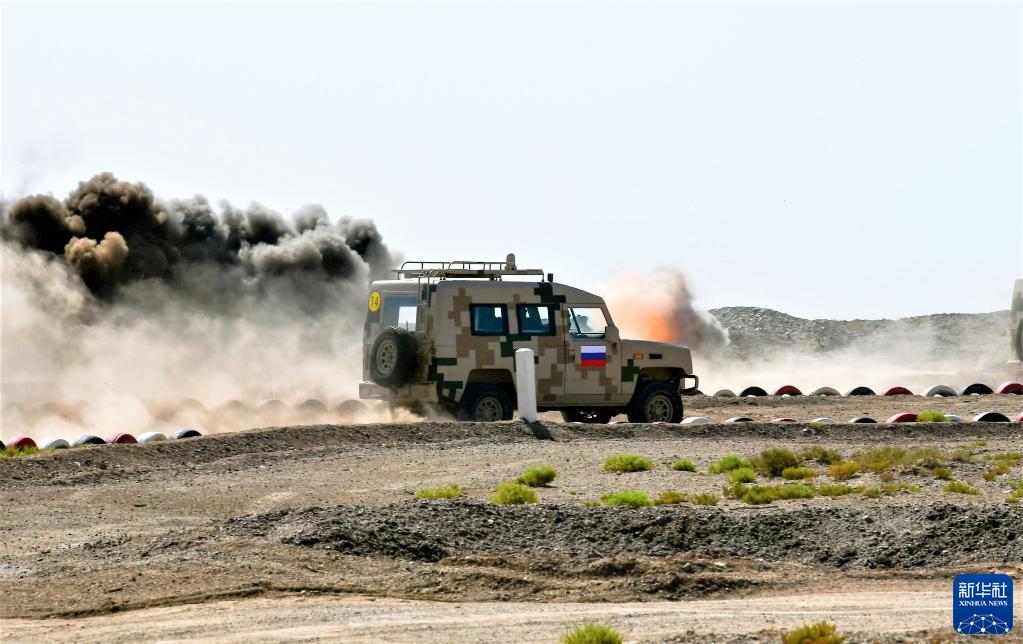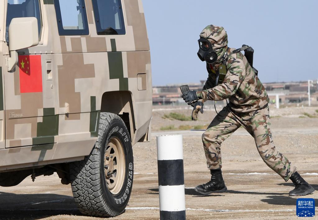 8月31日,“国际军事比赛-2021”中国库尔勒赛区“安全环境”项目接力赛举行,中国参赛队通过炸点路段。新华社记者 张永进 摄