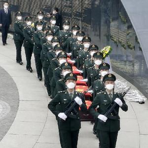 10时,军乐队奏响《思念曲》,仪式正式开始。在解放军战士持枪护卫下,礼兵护送志愿军烈士棺椁缓缓步入现场,全场奏唱中华人民共和国国歌。