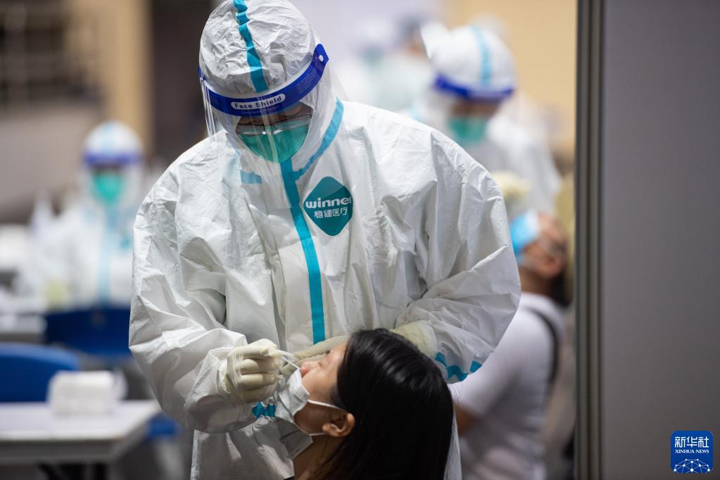 医护人员在澳门利马窦中学全民核酸检测站为市民采样(8月4日摄)。新华社记者 张金加 摄