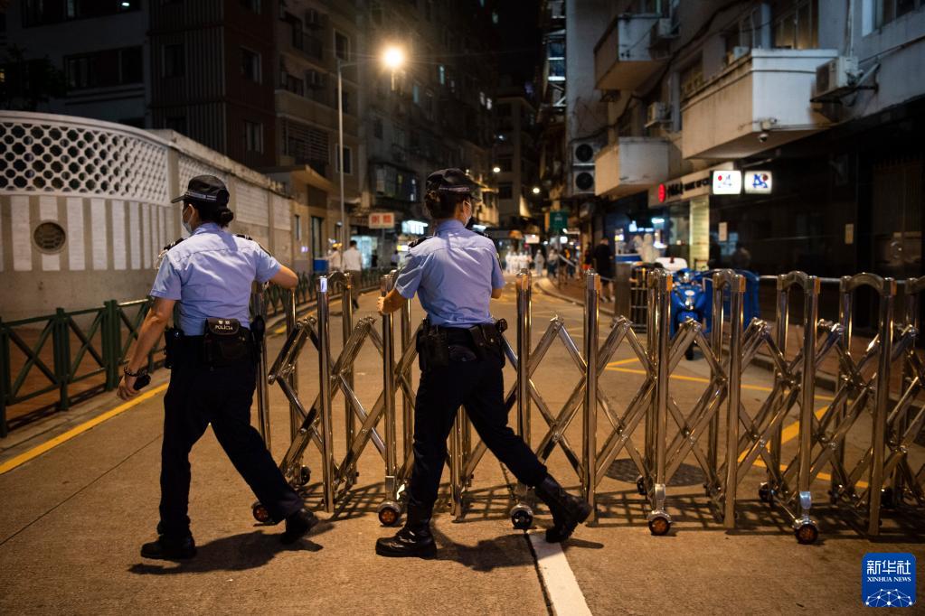 警员在澳门连胜街封锁线现场(8月3日摄)。连胜街为8月初澳门4名确诊病例居住的街道。新华社记者 张金加 摄