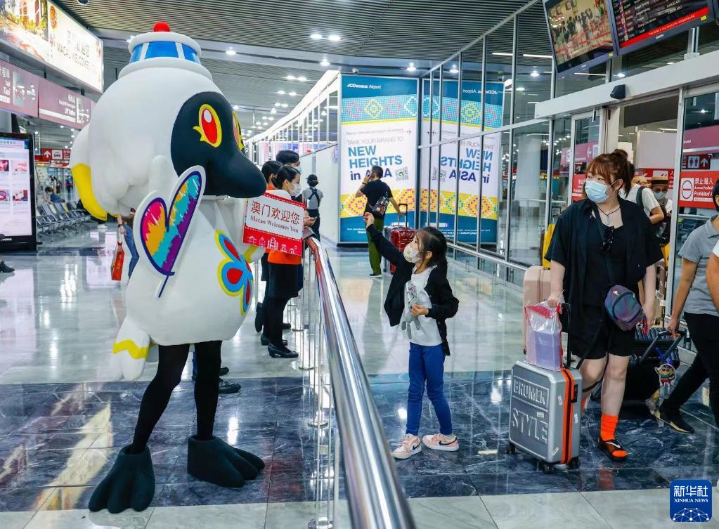 9月1日,澳门旅游吉祥物“麦麦”现身澳门国际机场欢迎抵澳旅客。新华社发