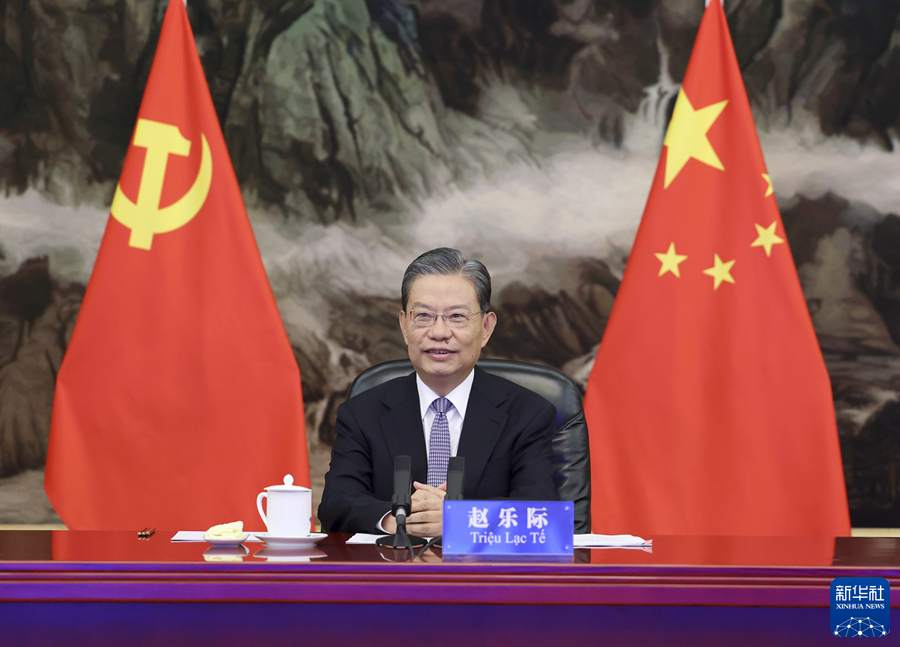 9月7日,中共中央政治局常委、中央纪委书记赵乐际在北京以视频方式会见越南共产党中央政治局委员、中央书记处书记、中央检查委员会主任陈锦绣。 新华社记者 丁海涛 摄