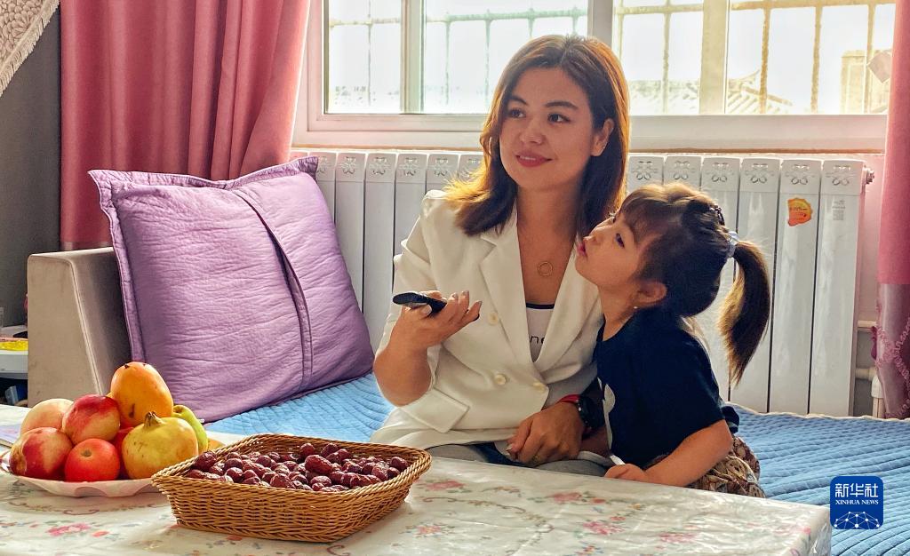 这是在河南省南阳市镇平县石佛寺镇“天下玉源”社区生活的热阿衣兰·阿不来提和她的女儿(9月2日摄)。新华社记者 韩朝阳 摄