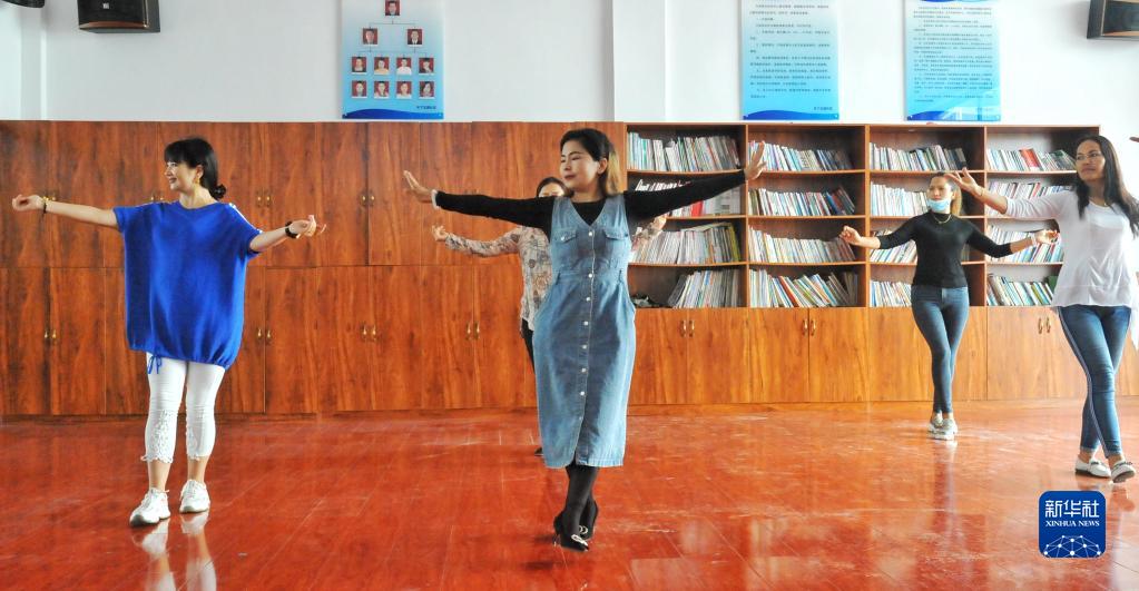 9月2日,在河南省南阳市镇平县石佛寺镇“天下玉源”社区活动室,舞蹈队在排练节目。新华社记者 韩朝阳 摄