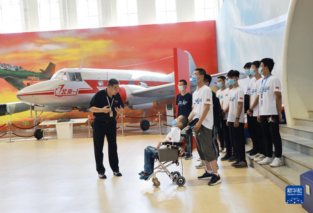 邢益凡与同学们参观位于北航校内的航空航天博物馆(9月7日摄)。新华社发(邸白鹭摄)