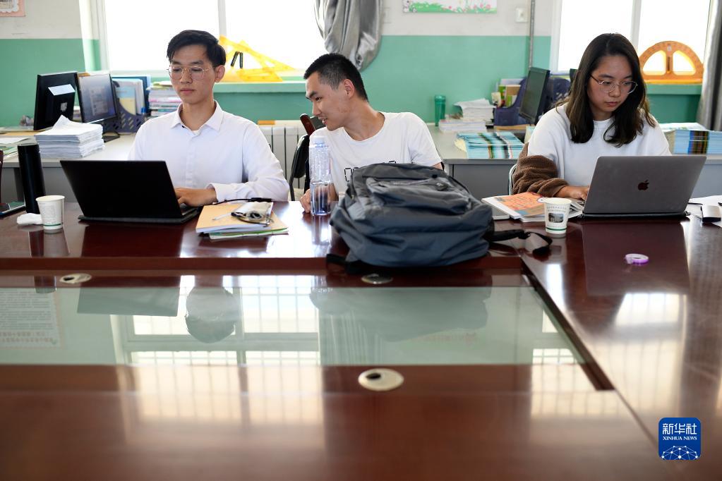 复旦大学第23届研究生支教团支教老师史欣安(中)、林伯韬(左)、徐菁在王民中学办公室备课(9月1日摄)。新华社记者 王鹏 摄