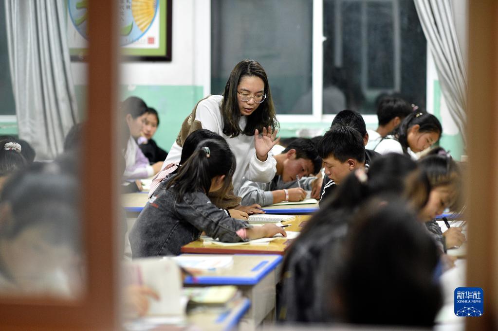 复旦大学第23届研究生支教团支教老师徐菁在晚自习上为学生解答问题(9月1日摄)。新华社记者 王鹏 摄