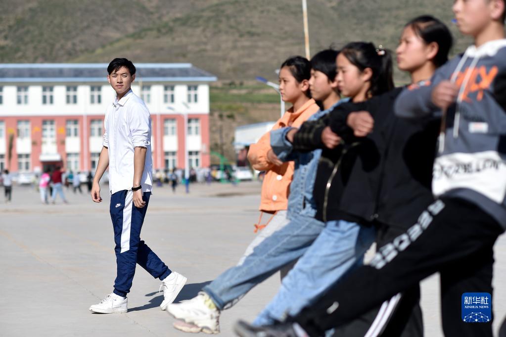 复旦大学第23届研究生支教团支教老师林伯韬(左一)在操场上指导学生练习队列(9月1日摄)。新华社记者 王鹏 摄