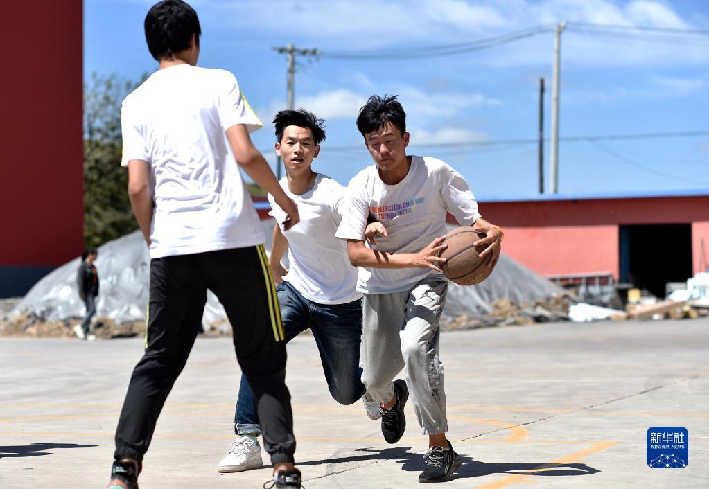 复旦大学第23届研究生支教团支教老师林伯韬(中)与学生一起打篮球(9月2日摄)。新华社记者 王鹏 摄