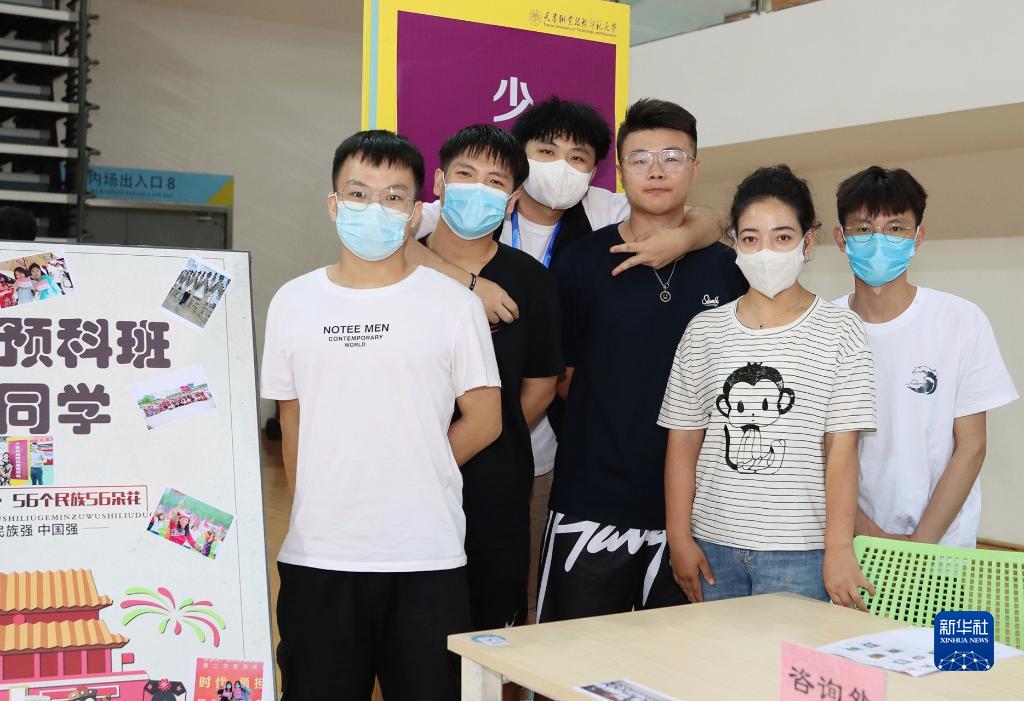 今年8月,天津职业技术师范大学少数民族专职辅导员佐合热·喀斯木(右二)迎接2021级少数民族预科班学生,并与学生们合影(资料照片)。新华社发