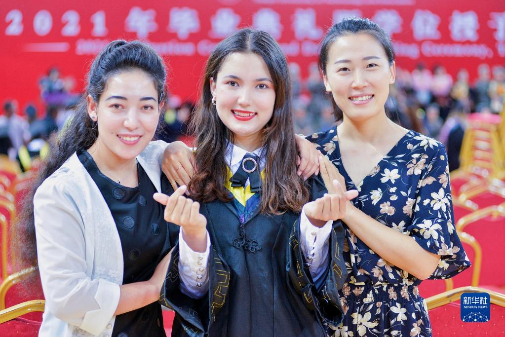 天津职业技术师范大学少数民族专职辅导员佐合热·喀斯木(左一)与学生在该校2021年毕业典礼上(资料照片)。新华社发