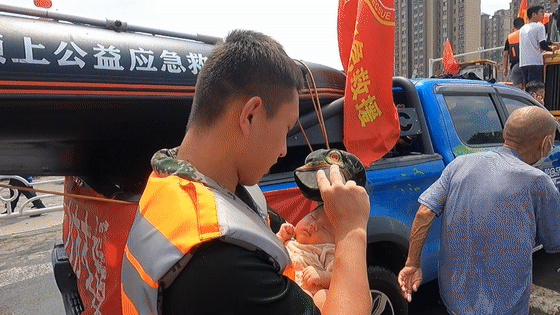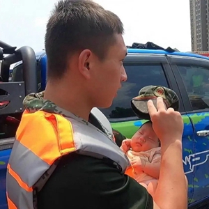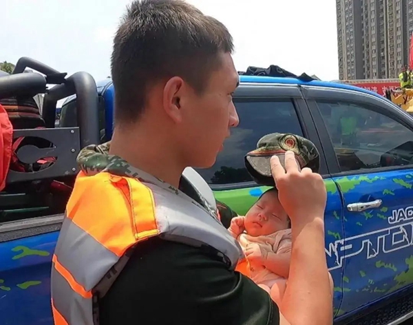 一名武警战士怀抱婴儿的画面