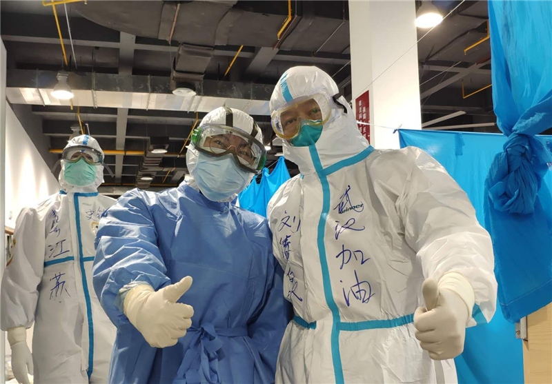 2020年3月,在江夏方舱医院采访,与援鄂专家合影
