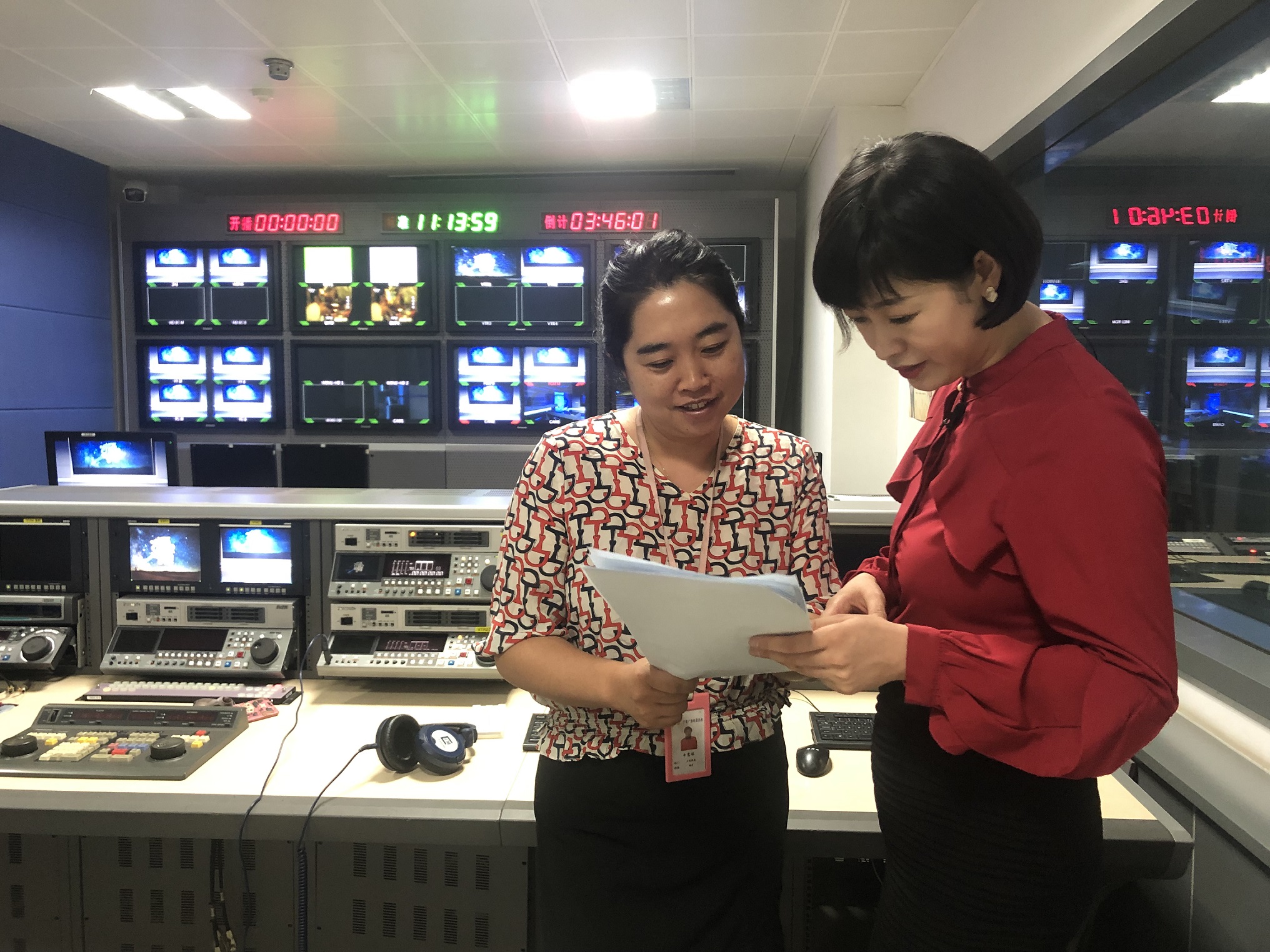 宁夏广播电视台 牛嵩琳 工作照1----与主持人沟通“两晒一促”大型文旅推介活动特别节目《宁夏文旅会》的解说词
