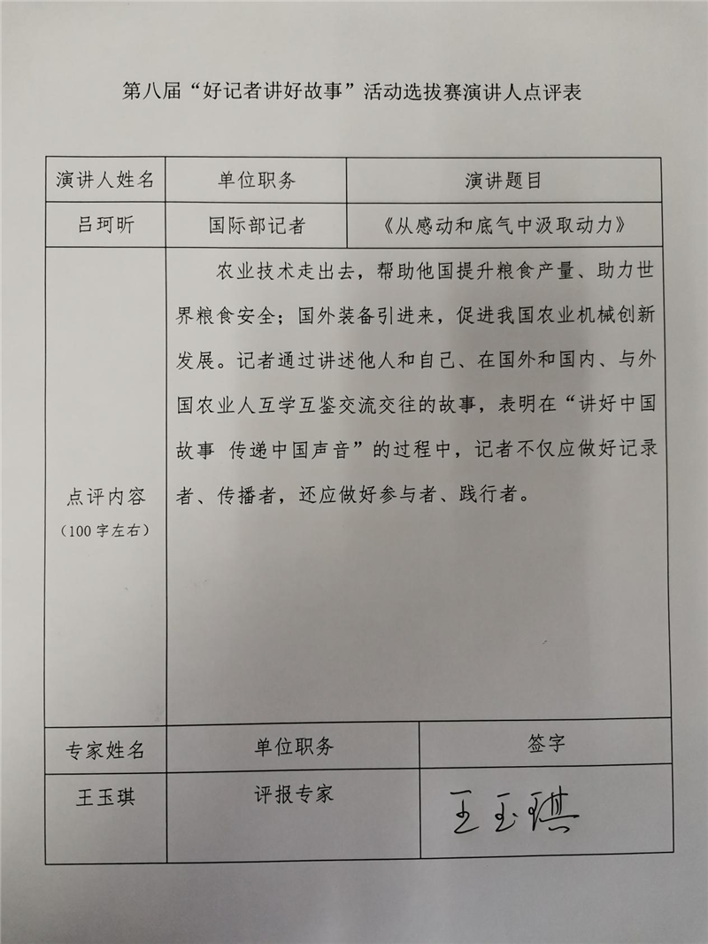先后参与采访报道过2016年G20农业部长会议、2018年中非合作论坛北京峰会、第二届“一带一路”国际合作高峰论坛以及首届中国国际进口博览会等国际性重要峰会展会,新闻代表作有大使访谈系列“农业合作是津中关系重要支柱”等,援外专家风采系列“别忘了,有这样一群援外农业专家”等,庆祝新中国成立70周年的编辑部文章《大国崛起 根基在农业》及特困片区脱贫记系列报告文学《风起秦巴》等作品,曾获第28届中国新闻奖国际传播类三等奖。