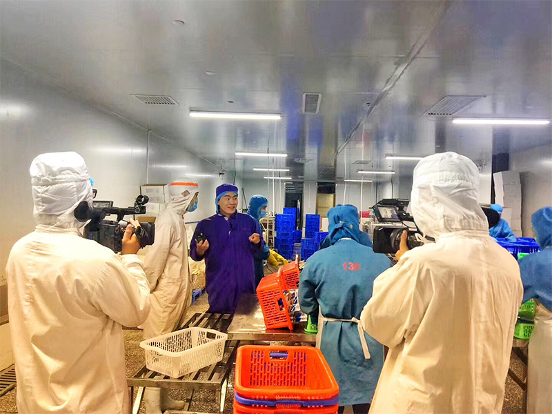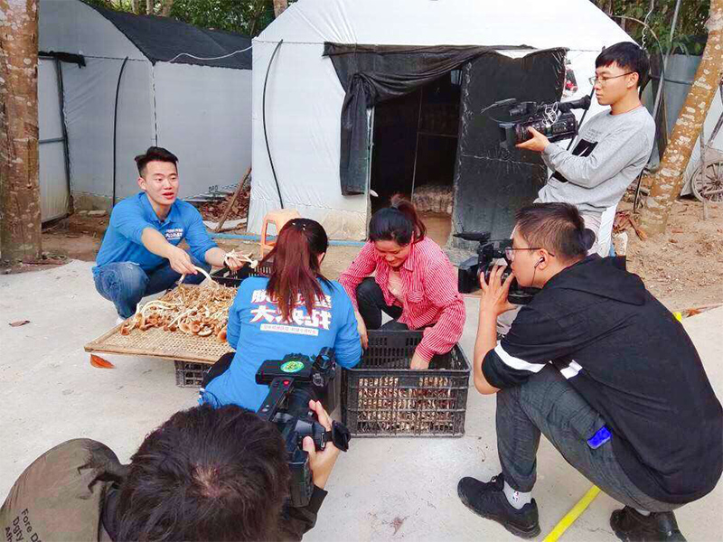 图为海南广播电视总台记者曾实在陵水蘑菇产业基地采访