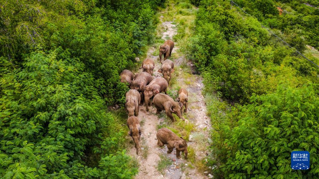 这是8月9日在云南省玉溪市元江县境内拍摄的象群(无人机照片)。新华社记者 胡超 摄