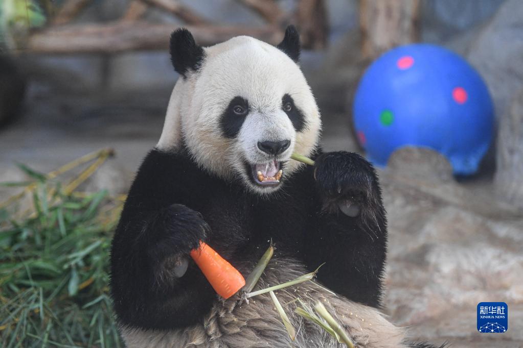 在位于海口的海南热带野生动植物园,大熊猫“舜舜”在享用美食(6月14日摄)。新华社记者 蒲晓旭 摄