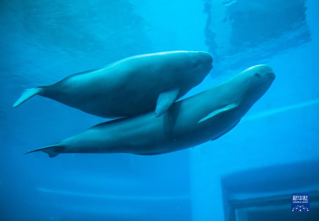 在位于武汉的中国科学院水生生物研究所,长江江豚妈妈和小江豚在水中游动(7月5日摄)。新华社记者 肖艺九 摄