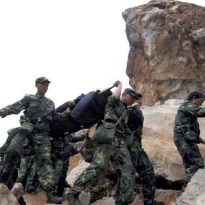 四川省北川县灾区,武警战士抬着刚救出的伤员(2008年5月14日摄)。新华社记者焦卫平摄